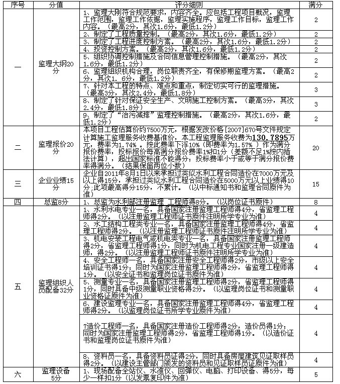 ⑤ 累计所有打分项以综合得分最高者推荐为第一中标候选人,出现2个或2个以上投标人综合得分相同时(指得分整数与小数点后两位均相同),以投标报价得分高的投标人排序在前;如投标报价得分仍一致时,以监理大纲得分高者排序在前。