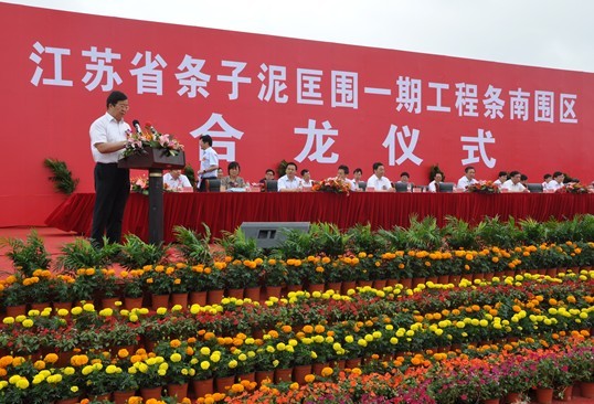 6月26日上午,条子泥匡围一期工程条南围区合龙仪式在工程施工现场隆重举行。省政府副秘书长徐立,省发改委、沿海办、财政厅、国土资源厅、环保厅、水利厅、审计厅、国资委、海洋渔业局、农业资源开发局、能源局、交通运输厅港口局、电力公司等省有关部门负责同志,盐城市、东台市主要领导同志出席合龙仪式。