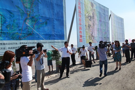 2012年7月28日上午,条子泥匡围项目工地彩旗招展,气球飘扬,省best365足球官网推进会的代表冒着高温酷暑莅临现场参观考察。参加这次活动的有:在宁省沿海地区发展领导小组成员单位主要负责人;南通、连云港、盐城市市委书记、市长、常务副市长,市发改委、经信委、沿海办、海洋与渔业局主要负责人,所辖县(市、区)党委、政府主要负责同志;其他省辖市及所辖县(市、区)政府主要负责同志;全省国家级和沿海三市省级开发区主要负责同志,共约250人。