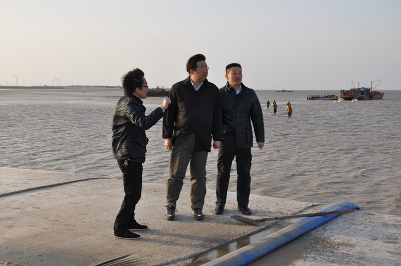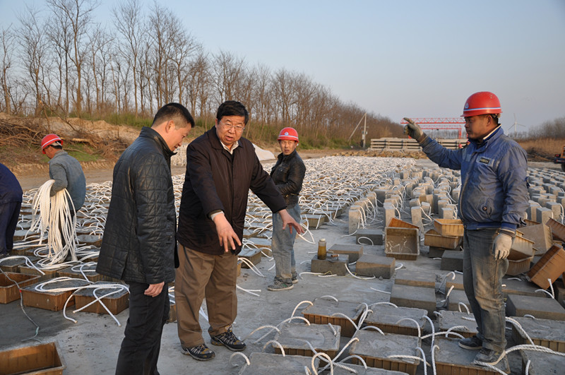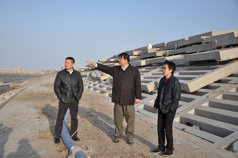 在北海堤堤脚,梁董事长一边沿着冲刷段实地查看冲刷及临时防护情况,一边向项目负责人仔细询问近期潮流变化及对堤身的影响。他强调,近几年沿海地区因港槽摆动及防护工程措施不到位造成的围堤垮塌事故时有发生,作为省百万亩滩涂开发的重点工程,我们不能抱有任何幻想,更不能麻痹大意,必须始终保持高度警惕。要高度重视北海堤防护实施的风险和难点,充分考虑将要遇到的困难和问题,投入足够的设计和施工力量,准备充足的物资和人力,从防护措施、工程质量、施工工艺等各个方面都达到一流目标,确保防护工程的顺利实施和防护作用的有效发挥,把北海堤工程建设成为百年工程。