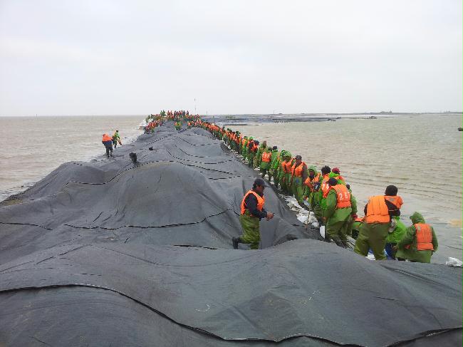 2013年4月4日,条子泥匡围一期工程条北片围区4#隔堤龙口顺利合龙,并经受住了大潮汛及5日寒潮大风影响的考验。此次龙口合龙,不仅实现了一期工程9.6万亩围区的封闭,而且部分阻断了近岸洋流通道,为北堤滩面的稳定及20m闸等骨干建筑物的投入使用创造了条件。