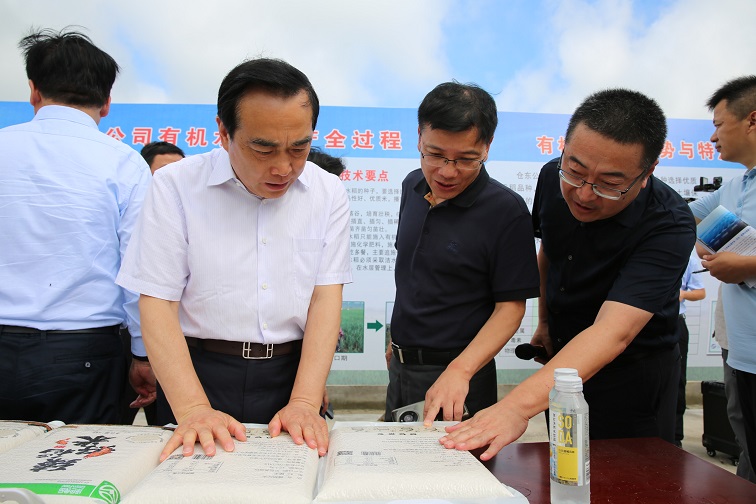 仓东公司有机水稻种植示范区土地广袤平整,秧苗泛着青绿随风轻摆,一派和谐美丽的田园景象。这里的水稻全程使用有机肥料,设置生物隔离带,采取人工除草,利用诱虫灯等设备进行大面积诱杀病虫害等措施确保水稻种植品质,经过两年的土壤改良,氮磷、有机质达到二级,钾达到一级。王荣平关心有机水稻的种植过程与销售,他指出,有机农产品有着广阔的前景,要严格按照有机种植标准,发挥土地资源优势,实现社会效益和经济效益双提升。