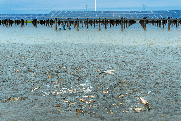 在连云港灌云县,利用3500亩养殖水面建成灌云洋桥200MW渔光一体示范项目(一期),有效结合现代渔业与智能光伏产业,形成上可发电、下可养殖的双效益模式,实现更高层次绿色低碳发展。光伏项目安全运行570余天,累计上网电量超42380万kwh,参与绿色、绿证交易,实现碳减排42.25吨;光伏下低密度草鱼养殖,套养花白鲢对虾,对虾养殖亩产量50斤,陆基循环水设施养殖今年4月开展南美白对虾苗淡化标粗4070万余尾,养殖鲈鱼1万余尾,年可实现两茬苗种标粗和一茬成鱼养殖。