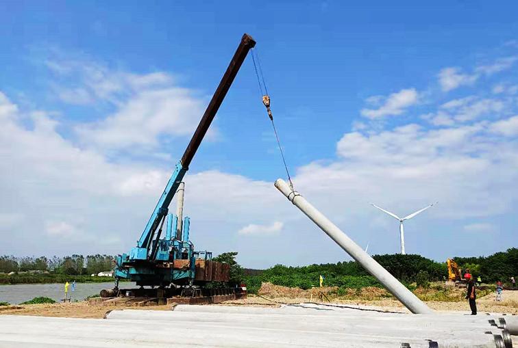 8月19日,大丰区三龙镇龙南村斗龙港河南岸省沿海农发“粮食科技产业园”项目码头施工现场,二十多根PHC管桩整齐排列,一台庞大的静压桩机稳坐河边,伴随着阵阵轰鸣,缓缓吊起10米长的管桩进行沉桩施工。不远处两个班组工人正头顶烈日,加紧进行钢筋预制、焊接作业。