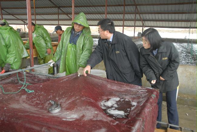 11月21日,盐城市出入境检验检疫局检查组到金东台农场检查出口水产品质量安全示范区日常监管工作。检查小组认真听取了质量安全示范区建设领导小组副组长、金东台农场场长任之华的汇报。随后,检查小组仔细察看了日常监管记录,并冒雨亲赴各塘口检查,悉心询问投入品使用情况以及具体的监管措施,通报了国家对投入品最新的监管要求,对个别细节问题提出了整改意见。最后,检查小组对日常监管整体工作表示满意,并指出,示范区的监管方式是行之有效的,通过规范、合理、严格的质量安全监管,示范区的放心农产品大大丰富了居民的菜篮子。